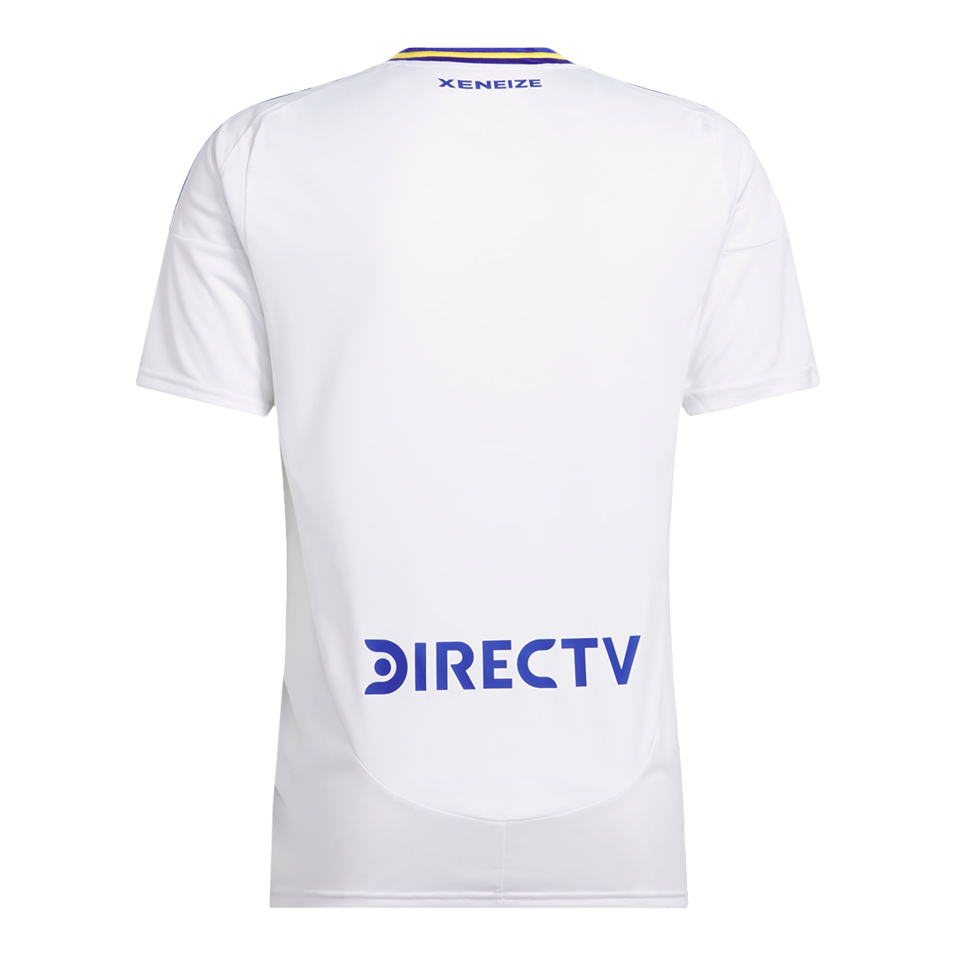 Boca Juniors Away Soccer Jersey 2024/25 OUT NOW! Boca Juniors jersey is designed with white as main color, then complementing with blue and yellow colours. The Boca Juniors jersey 24/25 is inspired by long “tirantes” banners that run down La Bombonera’s stands, which has a huge meannig to Boca Juniors football club. We can see the “XENEIZE” (“GENOESE”) nickname is added on the upper back – are in blue. Blue and yellow accents are designed in the centre, on the shoulders, collar and side panels of Boca Juniors camisetas futbol. It’s time to show your support for the iconic football club with this stylish and high-quality Boca Juniors jersey.The whole Boca Juniors kit is completed with matching white shorts and socks.