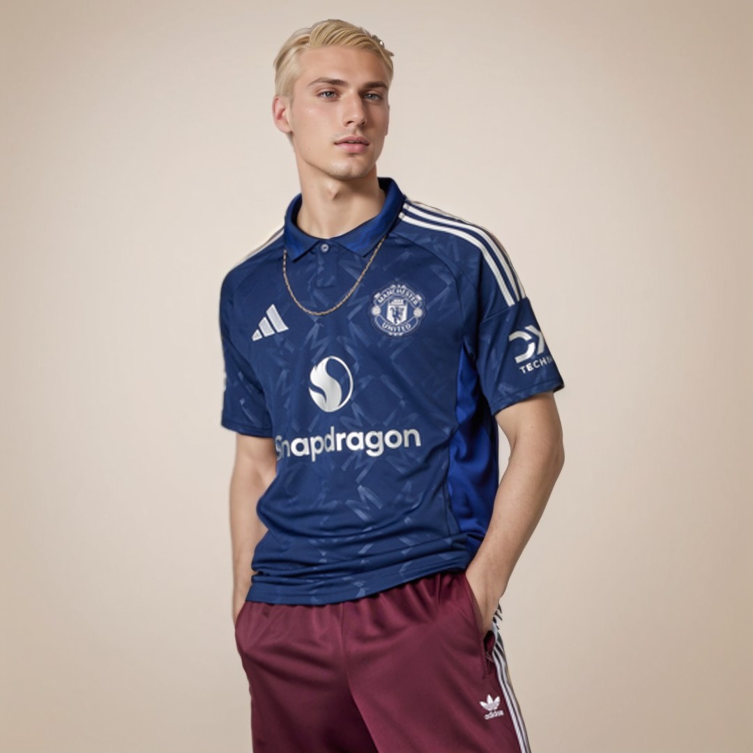Description about the Manchester United jersey: Released on July 25, 2024, thenew Manchester United jersey 24-25 awaydraws inspiration from the club’s legendary kits of the 90s.Manchester United jerseyfeatures a navy blue base complemented by light silver logos and vibrant red accents. The design includes a royal blue, textured element with repeated circular patterns, paying tribute to the 3D monograms that were a hallmark of Manchester United kits three decades ago.Manchester United jerseyfeatures an all-over zig-zag graphic built around a bespoke ‘M’ design on the front. The collar is adorned with a trio of blue lines, symbolizing the three rivers that connect the city, including the route linking Manchester to Old Trafford.